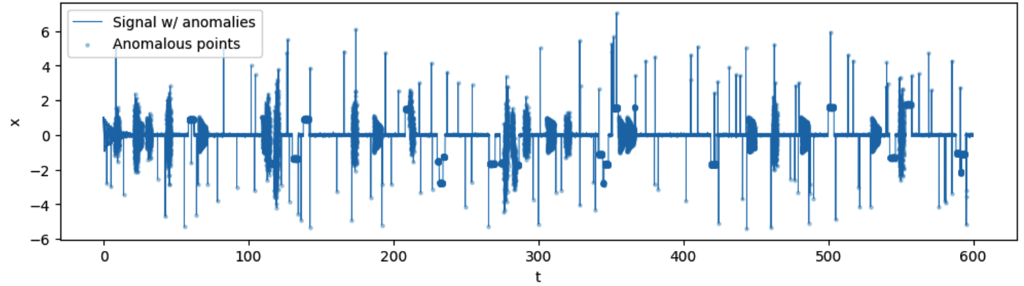 \[x(t) = e^{-\zeta \omega_0 t} \cos\!\left(\omega_0 \sqrt{1 - \zeta^2}\, t\right) + \varepsilon(t), \qquad \varepsilon(t) \sim \mathcal{N}(0, \sigma^2)\]where $\zeta$ is the damping ratio, $\omega_0$ the natural angular frequency and $\varepsilon(t)$ the Gaussian noise. I generate $T = 60,000$ samples spanning $t = 0$ to $t = 599.99$ with $dt = 0.01$ step. I then inject four types of anomalies: