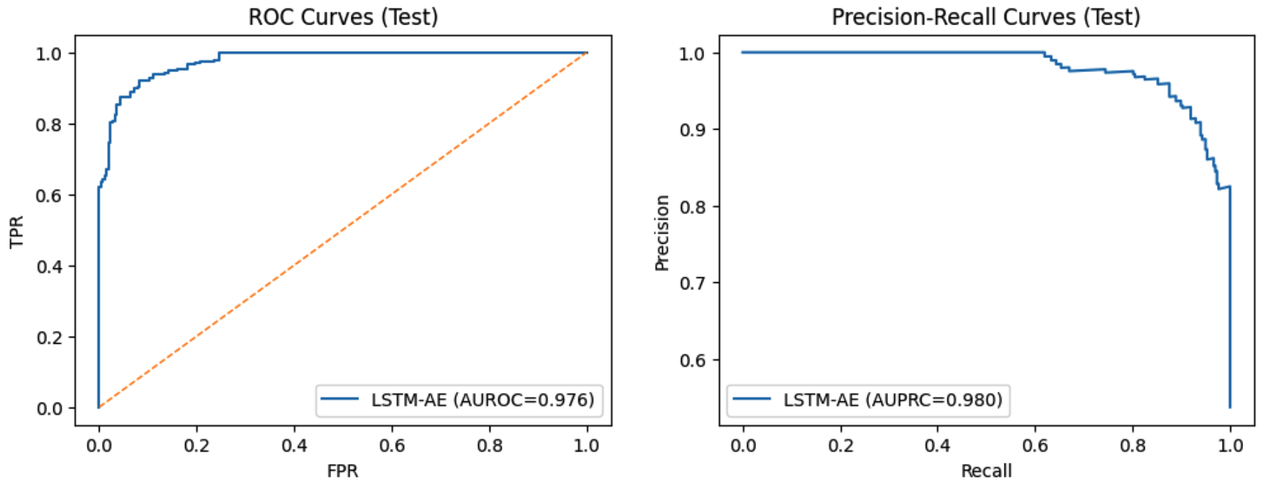 In a reconstruction-based anomaly detection setup, an LSTM Autoencoder is trained to reconstruct normal behaviour. When model is tested, windows that deviate from learned dynamics give higher reconstruction errors and are flagged as anomalies if the errors exceed the set threshold. The training methods studied are: