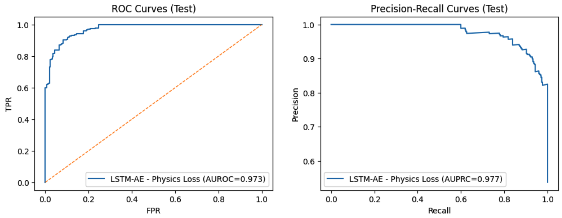 This project explores and compares an LSTM Autoencoder model trained with MSE loss and Physics-informed loss for anomaly detection on synthetic damped harmonic oscillator data. Both models perform well, with 97% AUROC and 98% AUPRC, and under Youden J. thesholding, the Physics-informed model achieves the best performance with 91.3% F1 score and 90.2% Recall, indicating better sensitivity thanks to the knowledge of the system’s dynamics.